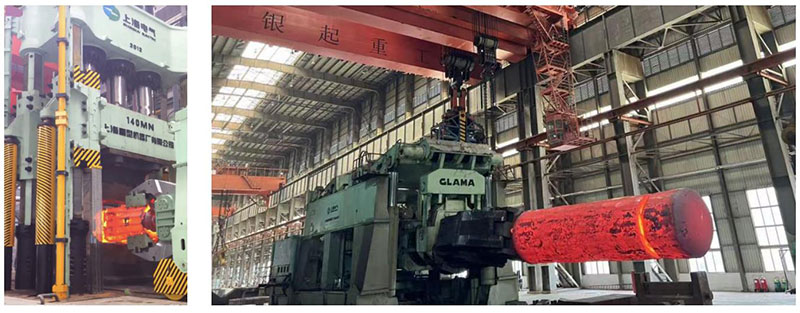 锻造环节作为核心制造工序,公司投入巨资打造行业领 先的生产矩阵,核心装备实力位居国内前列。目前,公司拥有140MN(14000吨)快速自由锻油压机,该设备属于国 家重大技术装备“国之重器”,采用伺服驱动及伺服阀控制技术,响应快速、控制精准,其9.5m净空距、9m开档的超大规格设计,可满足超大尺寸锻件的一次性成型需求。为保障锻造精度与效率,设备配套德国进口600T/M操作机,实现锻件的精准夹持与灵活转运,同时配备大型热处理炉、固溶水池等完善的配套设备,形成“锻造-热处理”一体化联动生产线,可对锻件进行精准的温度控制与性能优化,有效提升锻件的力学性能与使用寿命。